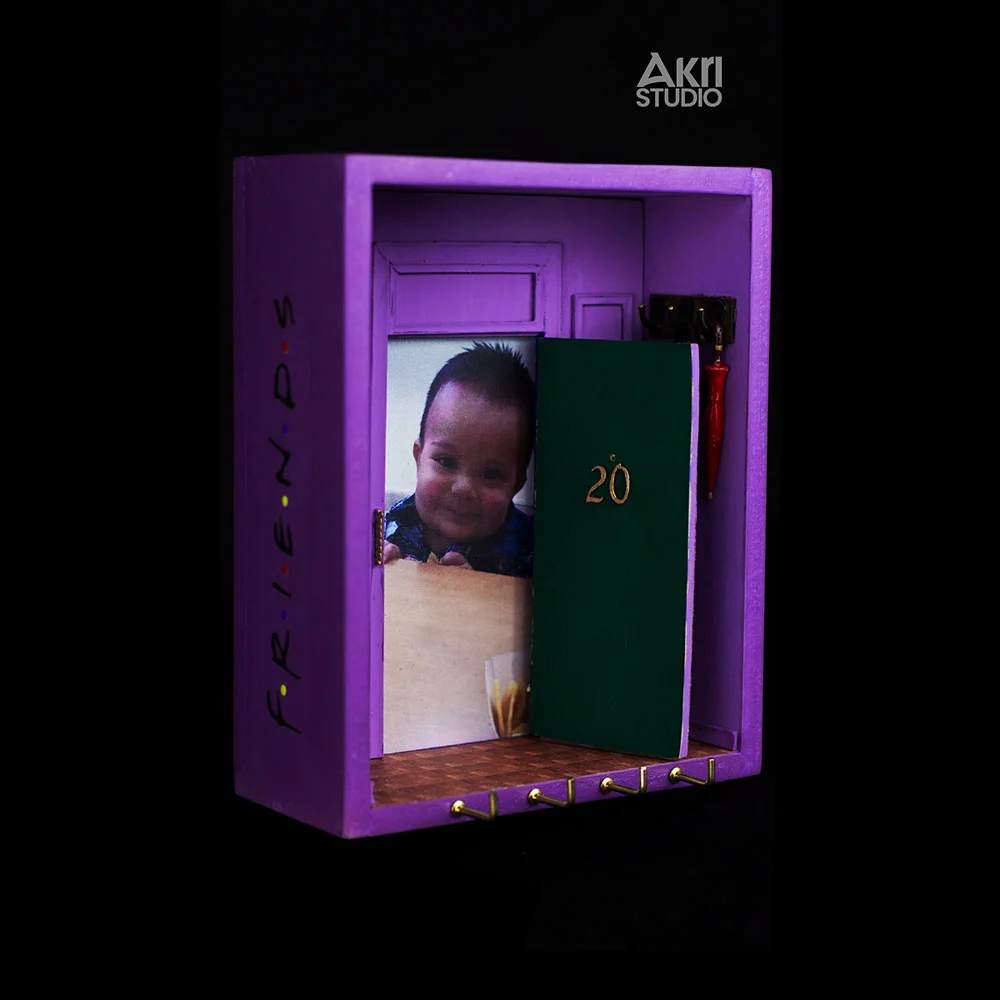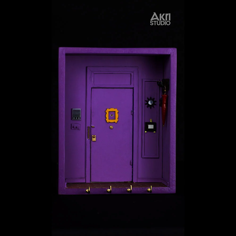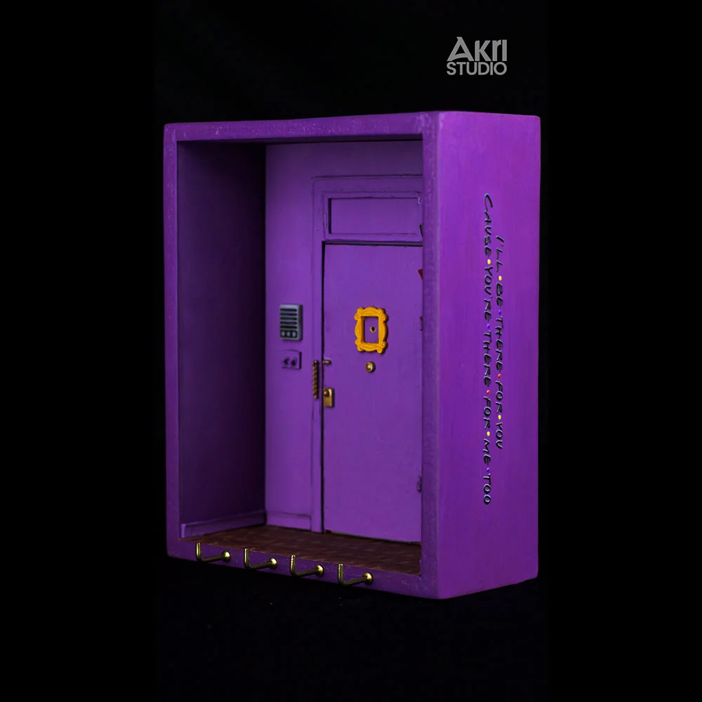 Mini diorama inspirado en la icónica puerta morada del departamento de Friends. Hecho a mano con detalles únicos, incluye ganchos metálicos para colgar tus llaves con estilo y un toque nostálgico para los verdaderos fanáticos de la serie.